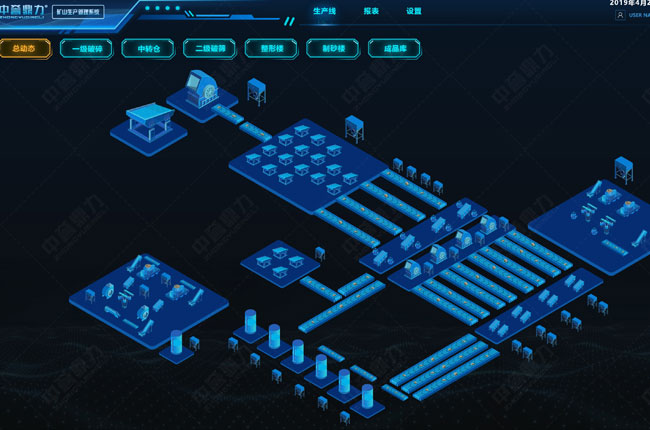 礦山生產管理系統主要用于對砂石生產線的自動化控制、設備狀態、成品產量、各料倉庫存、工藝流程的監控和檢測,以及設備溫度、電壓、電流’振頻德數據,通過三維可視化的展現方式,以集控為指令,實現整個砂石生產線智能操控管理、銷售集中控制與聯動。