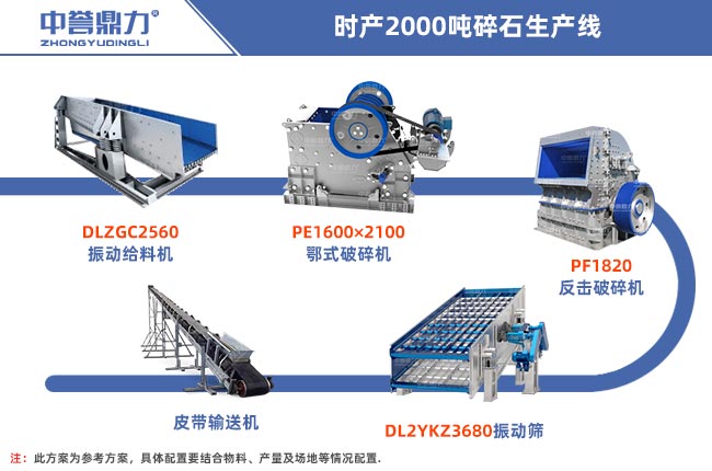 日產2萬噸石子生產線即時產2000噸石子生產線,一天工作10小時,具體配置可以用DLZGC2560振動給料機、PE1600×2100顎式破碎機、PF1820反擊式破碎機、DL2YKZ3680振動篩、輸送機等設備。本金充足條件許可的話,還可以搭配脈沖袋式除塵器減少粉塵污染,還有生產管理系統、自動裝車系統等智能化生產線軟件。配置清單如下: