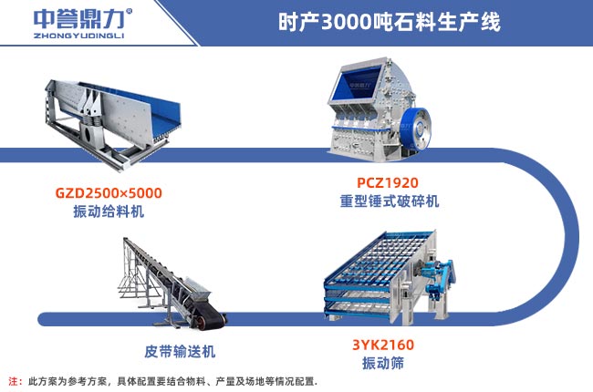 說明:一臺(tái)PCZ1920重錘式破碎機(jī)產(chǎn)量在1500噸,上述方案需要采用雙線并行設(shè)計(jì),一般還會(huì)配上一臺(tái)或兩臺(tái)整形破,用于回料破碎,以提升生產(chǎn)線生產(chǎn)效率。