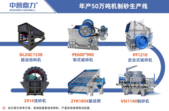 年產50萬噸機制砂,按照每天工作8小時來計算,投建機制砂生產線的時產量需120噸到200噸左右,根據生產需求,可配置干法和濕法制砂生產線。由于不同客戶的產能、進出料等實際需求不同,設備配置會有差異,投資價格大致也要幾十萬到幾百萬。