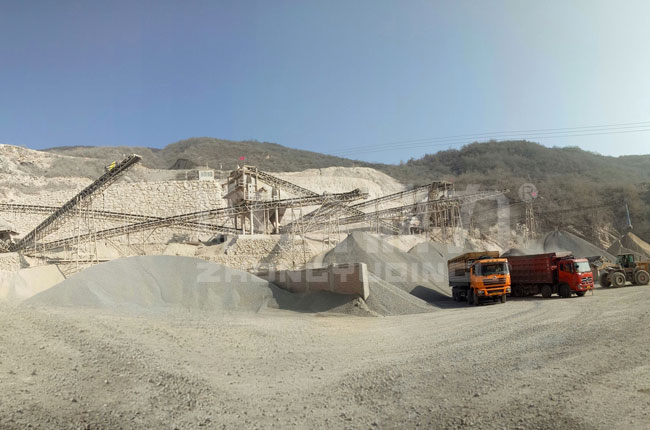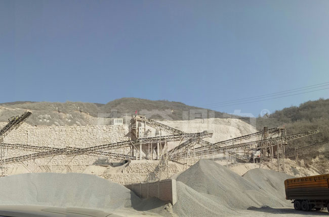 該項目是2017年投入生產(chǎn),是一條生產(chǎn)12、13等石子骨料的石灰石粉碎生產(chǎn)線,主要采用的是1615型頭道破碎機+1216整形破+振動篩。