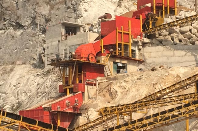 原石料通過卸料倉,由棒條式給料機對原料進行預處理,篩下的石料通過振動篩篩選,反擊破細碎,再次篩分,其余大規格的骨料通過給料機均勻連續送進1615重錘破破碎,直接通過振動篩篩分,部分大規格石料會經過反擊破二次加工,其余混合料通過振動篩篩分不同規格的石料。