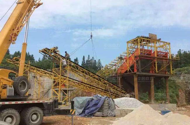 貴州凱里時產300噸石灰?guī)r破碎機生產線,采用一臺ZG1238給料機、一臺PCZ1512重錘破碎機、兩臺3YK1860振動篩和皮帶機,工藝流程簡單,出3種不同規(guī)格的成品骨料。