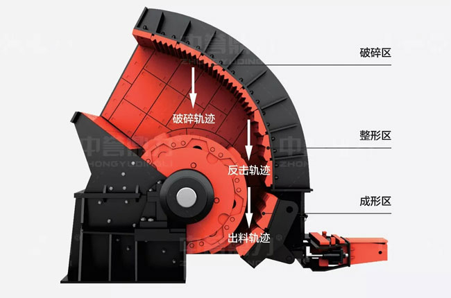 在物料進(jìn)入箱式破碎機(jī)后,經(jīng)過高速旋轉(zhuǎn)的錘頭沖擊而進(jìn)行破碎,破碎后的物料在錘頭處獲得動(dòng)能,高速?zèng)_向破碎襯板,同時(shí)相互撞擊,經(jīng)過多次破碎,小于篩條之間間隙的物料,就會(huì)從間隙中排出,較大的物料在篩條上再次經(jīng)過錘頭沖擊,直到可以被排出。